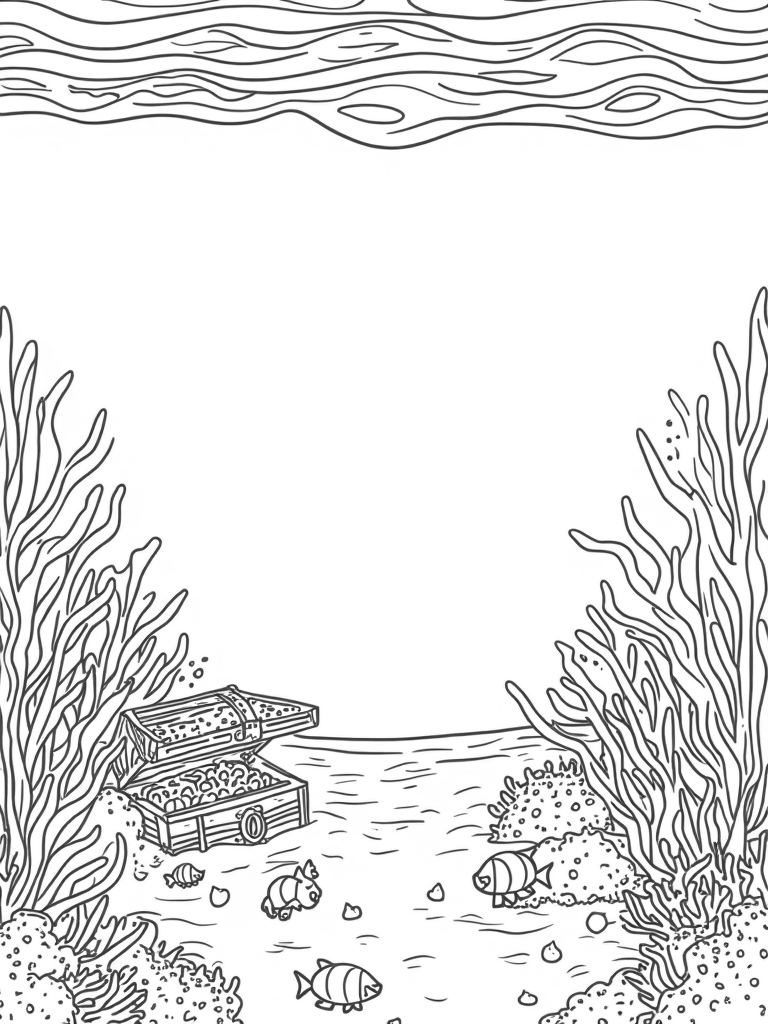 Above the reef, a sparkling sunbeam filters down from the surface, casting a warm glow over everything. If you look closely, you’ll spot a treasure chest nestled in the sandy bottom, playfully covered by some starfish. It’s like a little secret waiting to be colored in! The gentle waves in the background add a calming touch, making this scene feel serene and peaceful.