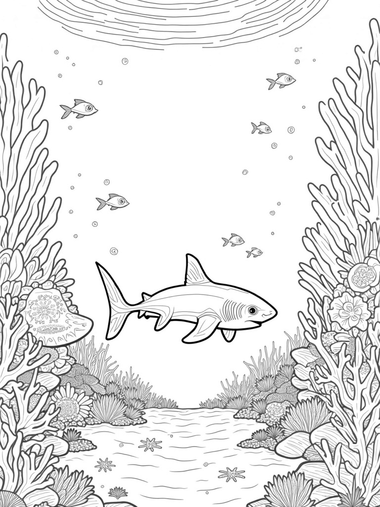 Giant Shark in a Vibrant Underwater Garden Coloring Page