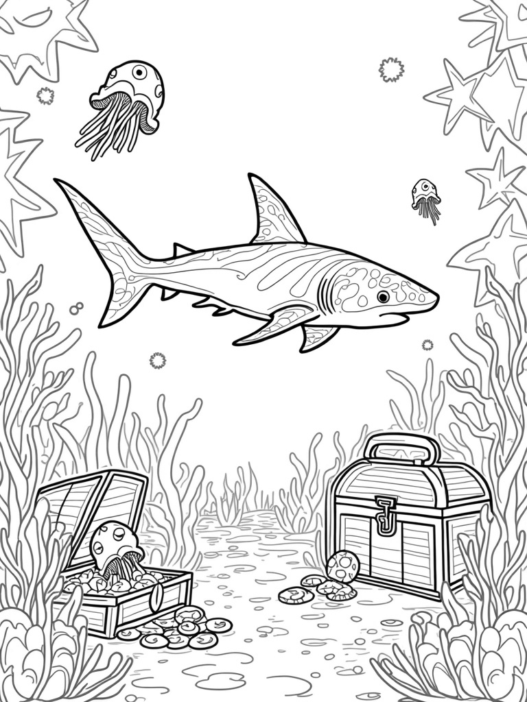Check out this free, printable coloring page featuring a majestic shark in a colorful underwater garden. Perfect for kids who love ocean life and want to get creative with their coloring skills!