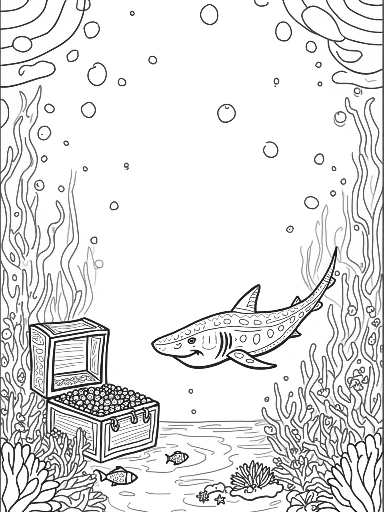 This free, printable coloring page features a majestic shark and an underwater realm with coral ruins, treasure, and colorful sea life. Perfect for kids who love ocean adventures and want to add their own splash of color!