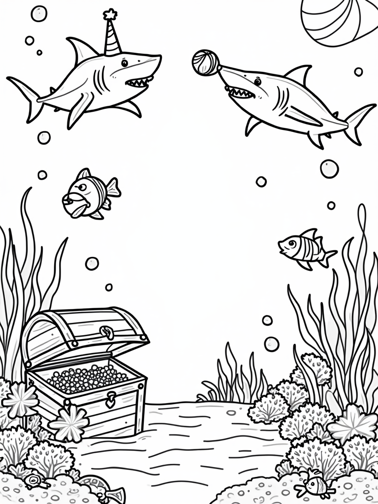 This lively underwater scene is bursting with fun! You’ll see a friendly hammerhead shark wearing a colorful party hat, ready to celebrate under the sea. Next to it, a sleek great white shark is showing off its skills by balancing a beach ball on its nose. How cool is that? And if you look closely, there's a sunken treasure chest overflowing with shiny seashells and sparkling jewels, surrounded by curious clownfish peeking from behind bright coral formations.