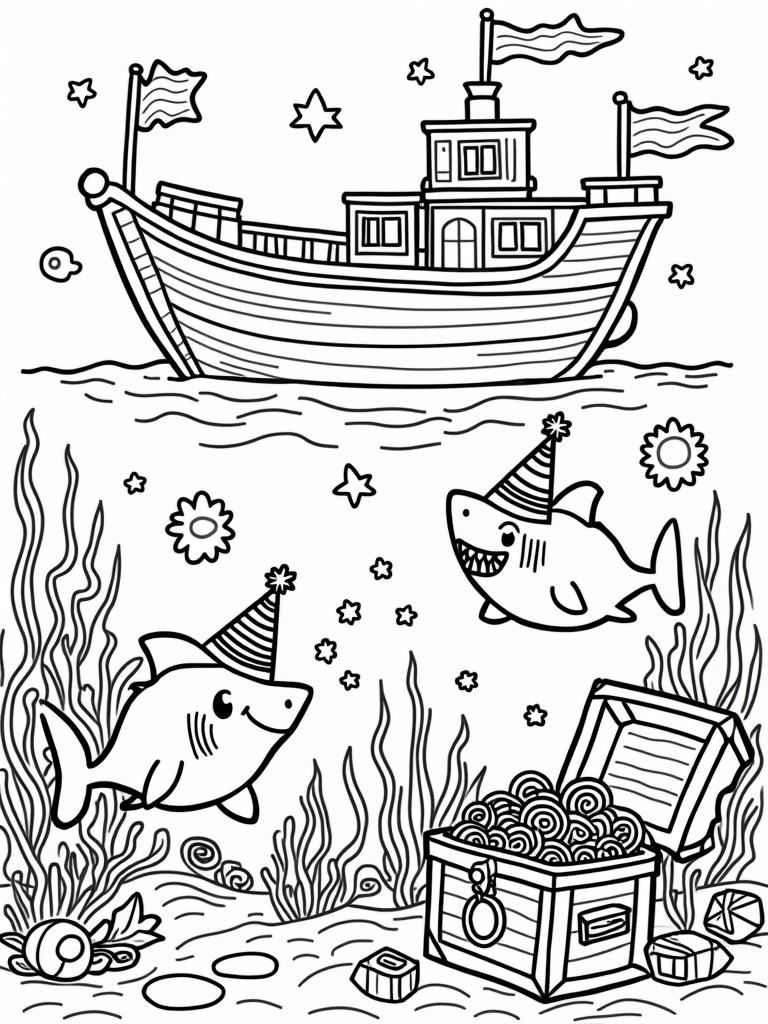 This underwater scene is all about fun! You’ll see a friendly shark wearing a colorful party hat, blowing bubbles that look like stars. It’s swimming among beautiful coral reefs, with a treasure chest nearby overflowing with shiny coins and sparkling gems. Schools of tiny fish are swirling around, creating shapes like hearts and spirals, which adds to the joyous vibe.