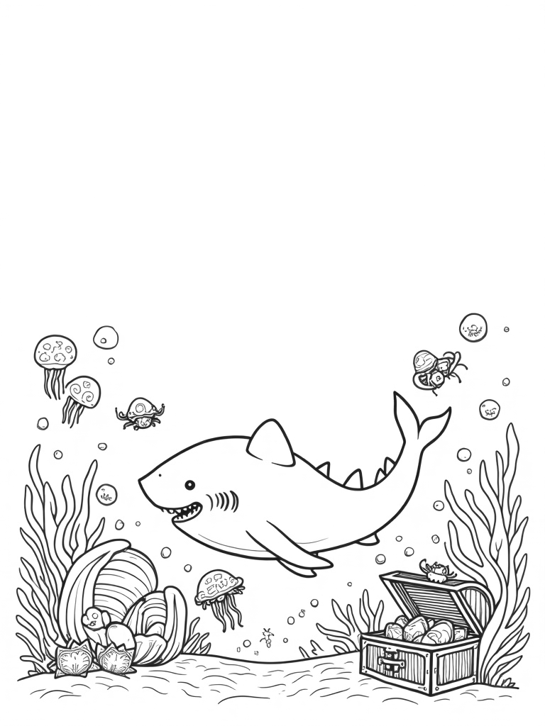 Dive into this free, printable coloring page featuring a giant crescent moon shark and a vibrant coral reef. Perfect for kids who love ocean life, this coloring page is packed with fun details to bring to life with color!