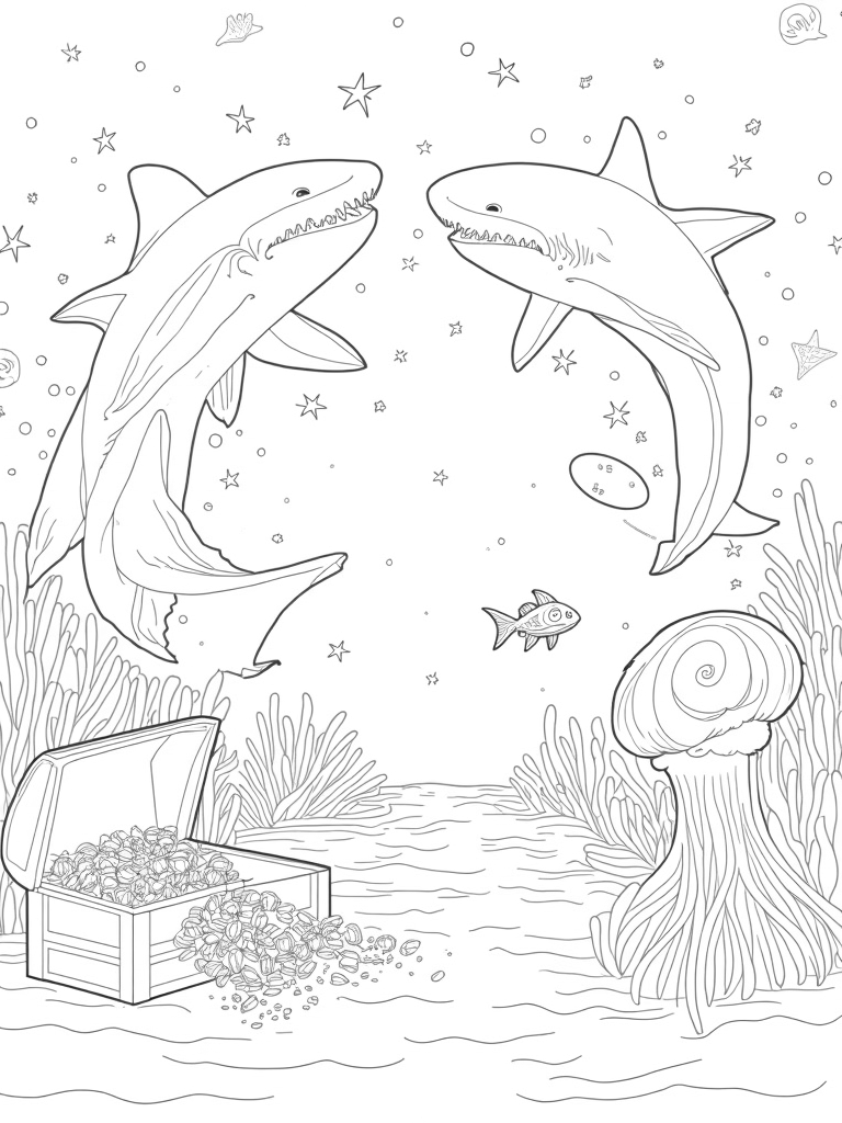 Beneath the sharks, a treasure chest has burst open, spilling out glittering gems and playful seaweed confetti! Just imagine the excitement as the colorful fish swim in spirals around it. And let’s not forget the large jellyfish floating serenely, its long tentacles trailing like beautiful ribbons in the water. It’s a scene full of life and joy!