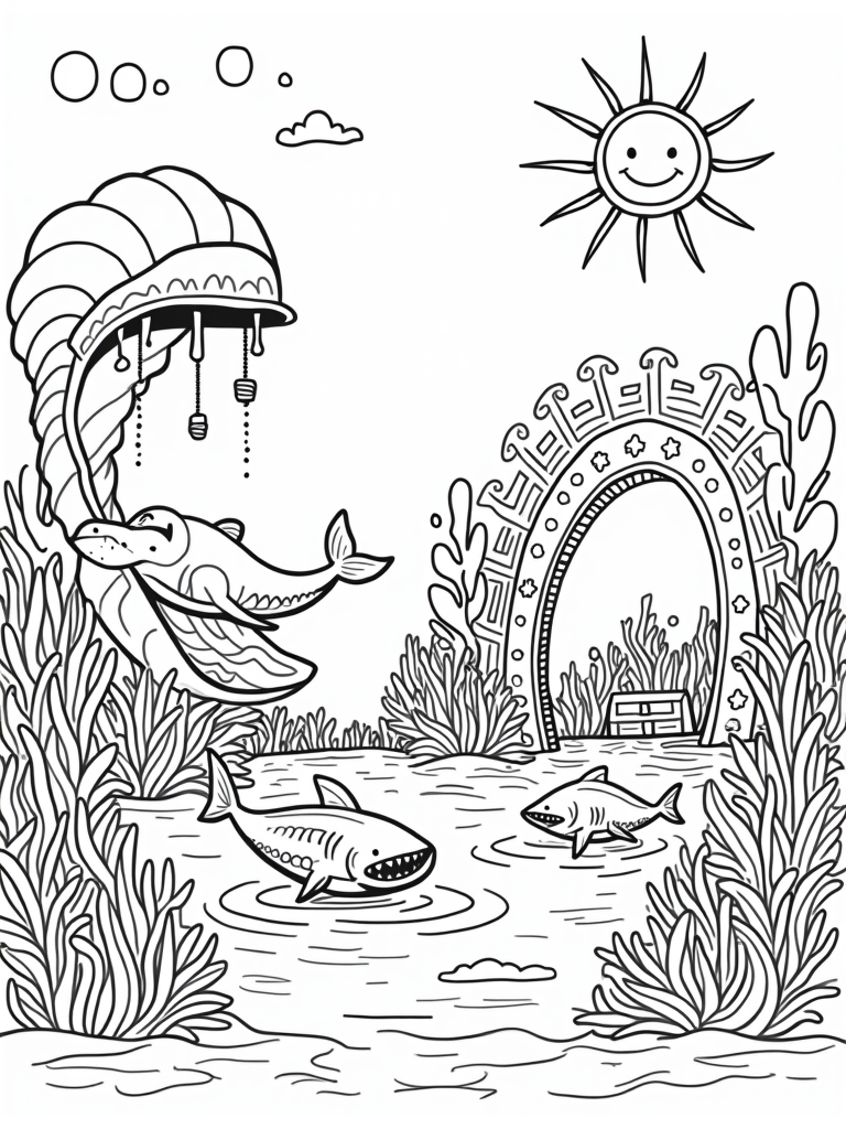 In the background, a smiling sun peeks through the water’s surface, sending wavy patterns dancing across the ocean floor. It’s a cheerful addition to this colorful scene, making it perfect for kids to bring their own creativity to life!