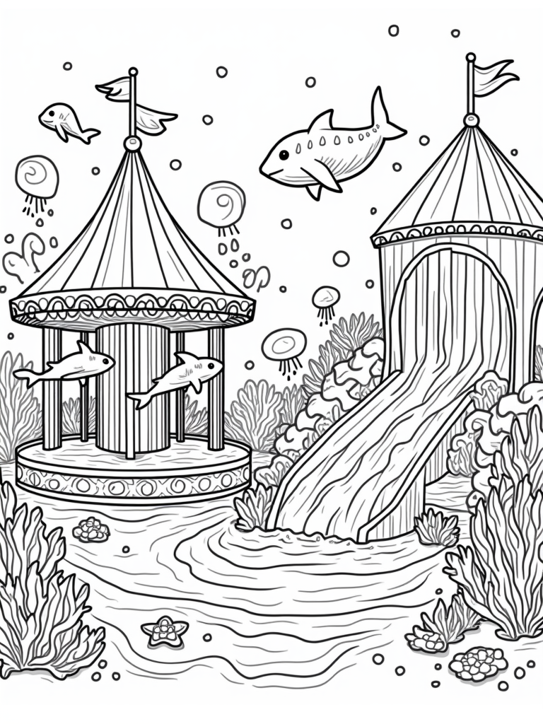 This coloring page showcases a vibrant underwater carnival, where colorful coral formations look like festive tents! You’ll spot playful sharks swirling around on a giant merry-go-round made of seashells, having the time of their lives. Floating above are jellyfish that glow like lanterns, adding a magical touch to the scene.