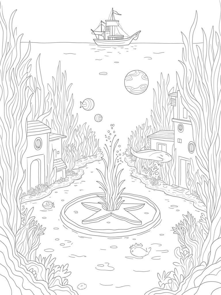 As you color in this lively scene, don’t forget about the colorful fish that dart between the open doorways of coral homes. They swirl around in mesmerizing patterns, adding even more life to this underwater community. And just above, a mysterious sunken ship rests quietly on the ocean floor, its softly glowing portholes inviting you to imagine the stories it holds. Who knows what treasures lie within?