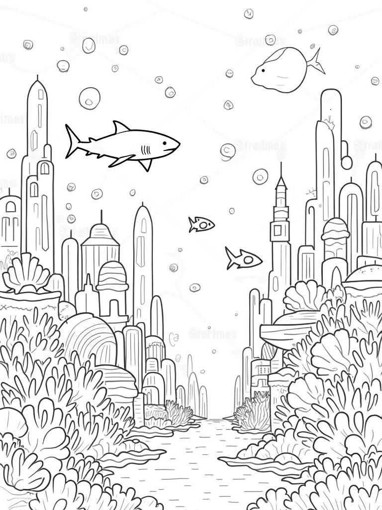 Underwater City of Coral and Seashells with Sharks Coloring Page