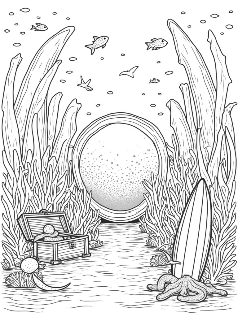 As you color, you’ll notice seaweed swaying gracefully around a treasure chest that’s hidden beneath the waves. And don't miss the playful octopus wrapping its tentacles around a colorful surfboard, adding a touch of fun to this underwater landscape. Each element invites you to use your imagination and creativity.