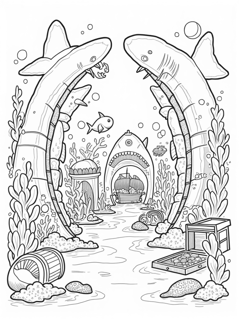 If you follow the sandy path, you'll arrive at an old shipwreck, where a nurse shark is lounging amongst treasure chests scattered on the ocean floor. It’s a peaceful spot where kids can imagine all sorts of stories about treasure and sea creatures. This coloring page invites little artists to bring this underwater world to life with their favorite colors!