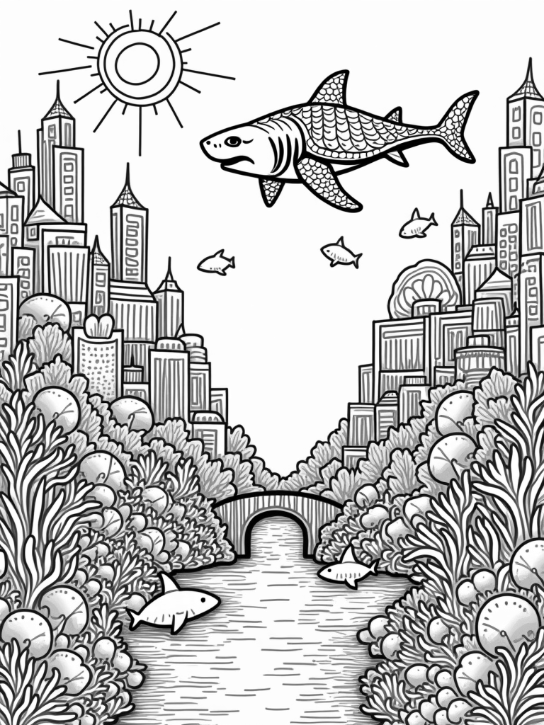 This coloring page is perfect for kids who love sea life and want to unleash their creativity. With all the intricate details, like the unique shapes of the buildings and the playful fish, there’s plenty to color. Whether you go for bright blues and greens or your own wild colors, it’s a chance to make this underwater world truly yours!
