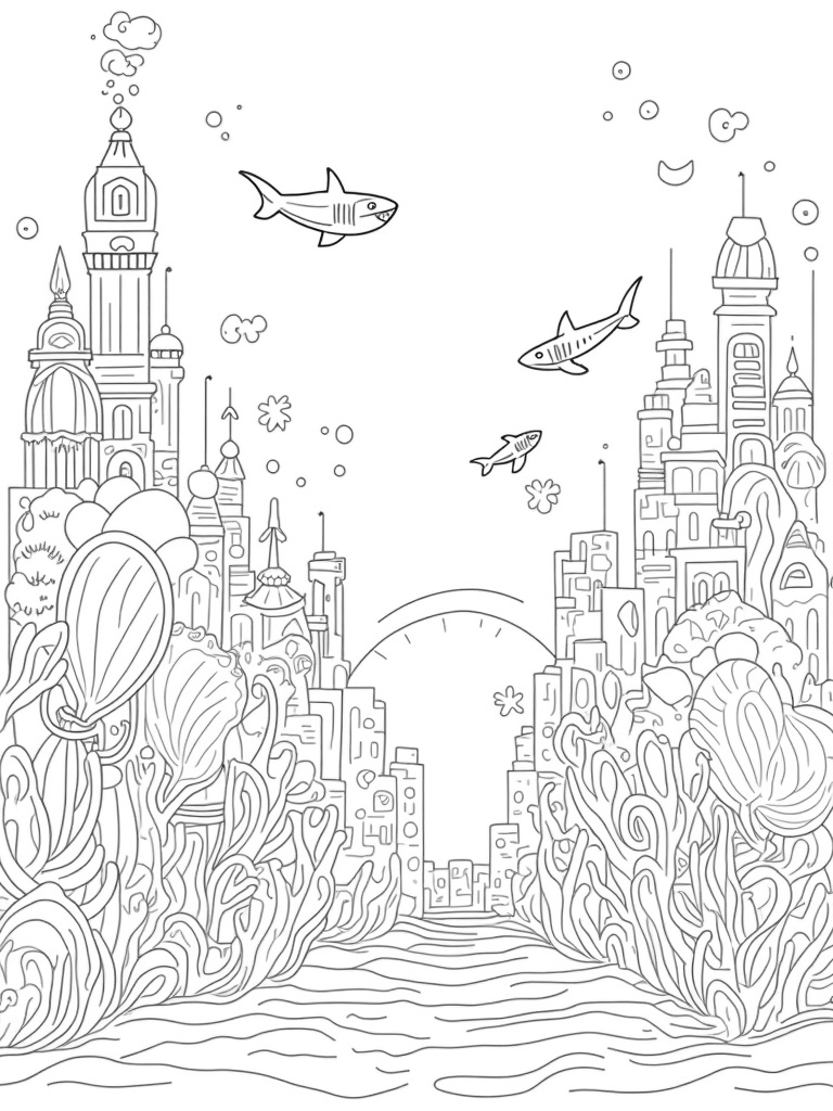 Underwater City with Colossal Sharks and Coral Archways Coloring Page