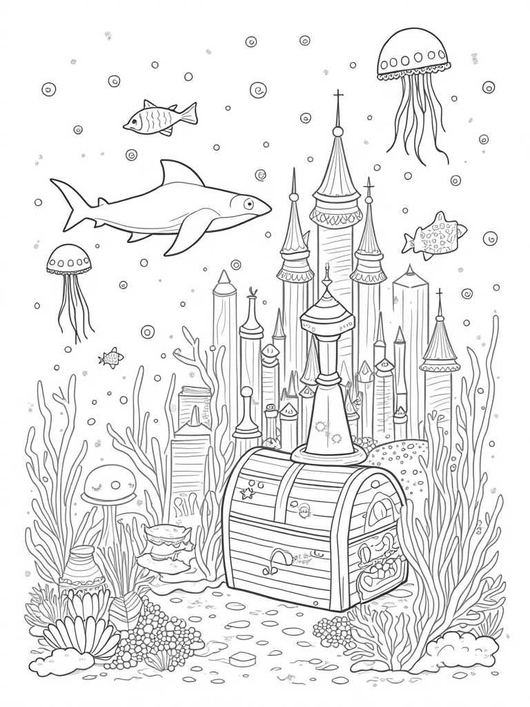 Underwater City with Coral Skyscrapers and a Shark Fountain Coloring Page