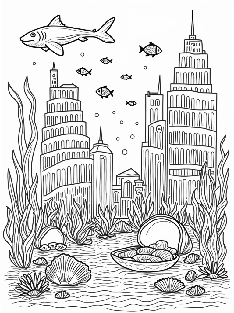 Check out this free, printable coloring page featuring an underwater city with coral skyscrapers and colorful fish. Perfect for kids who love sharks and sea life, it's a fun way to unleash creativity!