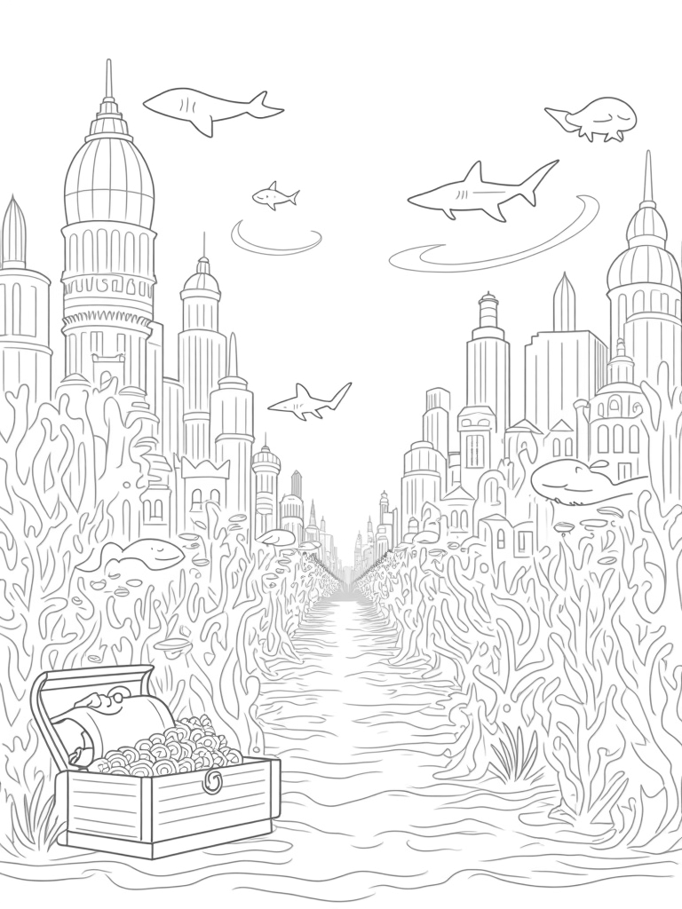 Underwater City with Coral Skyscrapers and Playful Sharks Coloring Page