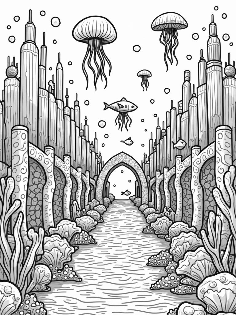 Above the city, delicate jellyfish drift lazily, their lace-like bell tops creating beautiful shadows on the ocean floor. These stunning creatures add a whimsical touch to the underwater landscape. Kids can have fun choosing colors for the jellyfish, starfish, and colorful pebbles scattered all around. What colors do you think would make this underwater world even more magical?