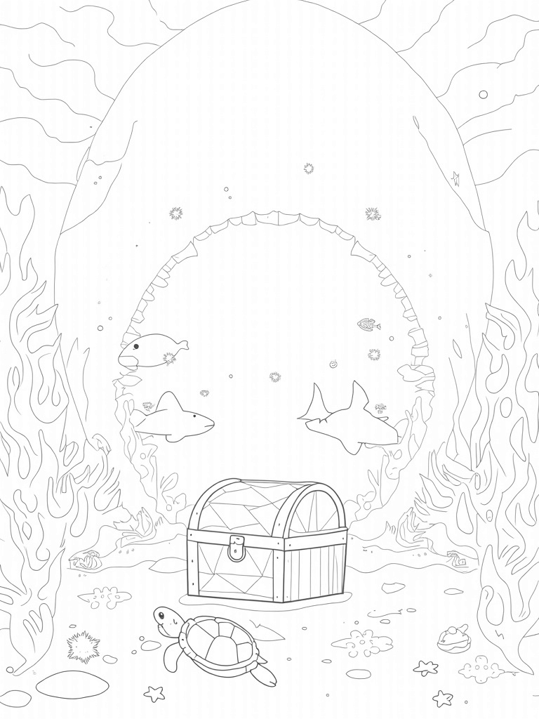 At the heart of it all, a beautiful treasure chest rests on the sandy seabed, surrounded by sparkling pearls and cheerful starfish. It’s like a hidden gem waiting to be discovered! And don’t miss the playful sea turtle gliding by, bringing even more life to this serene underwater scene. It’s a perfect spot for kids to let their imaginations run wild with colors!
