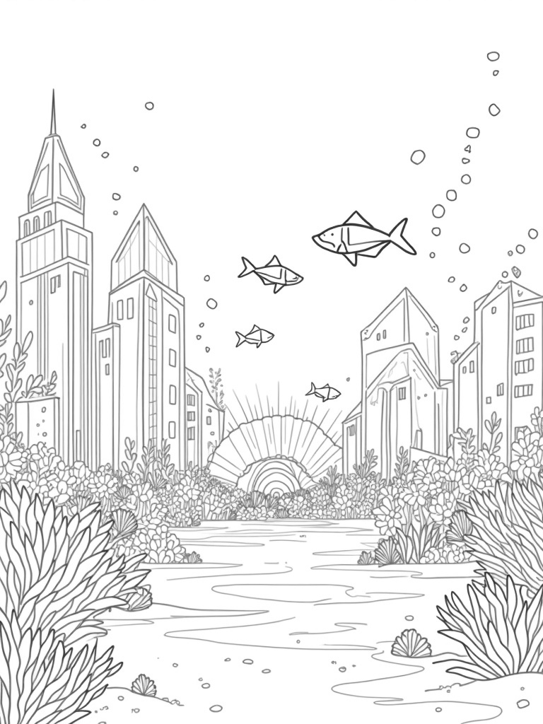 Underwater City with Shark-Shaped Buildings Coloring Page