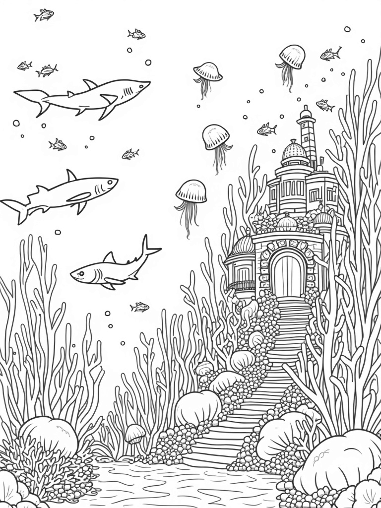 Clusters of fish swim around, creating a lively swirl that brings the whole picture to life. The combo of vibrant colors and whimsical architecture makes it a fun place to color. Just imagine choosing bright pinks for the jellyfish and deep blues for the sharks!