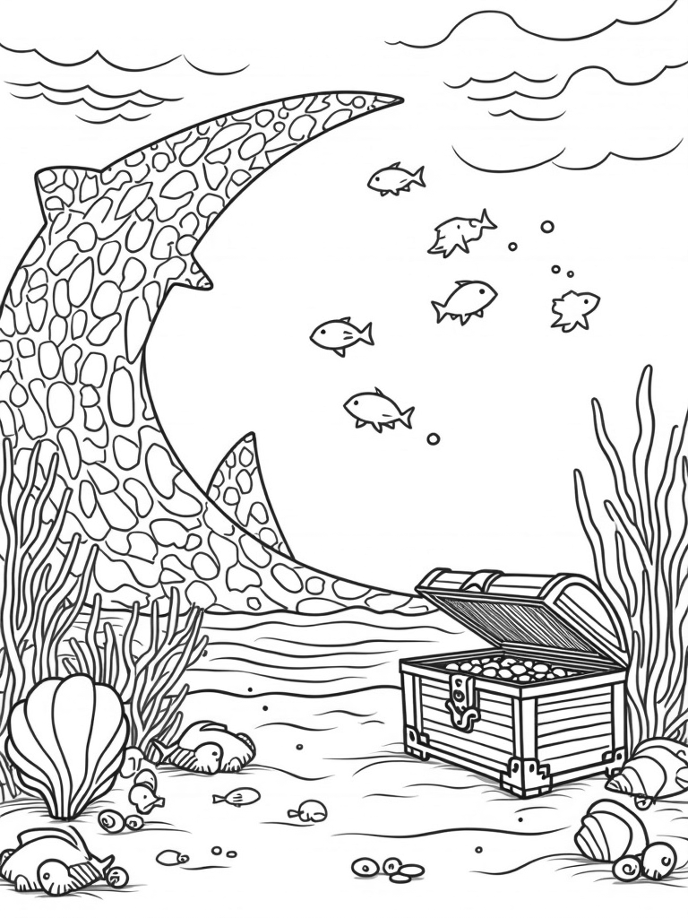 You won't believe your eyes when you see this vibrant underwater scene! Right at the center, there's a giant coral reef shaped like a shark's fin, just waiting for your favorite colors. Above the reef, colorful fish swim in perfect harmony, creating beautiful patterns against the deep blue ocean. And if you look closely, you'll spot oversized seashells lining the sandy ocean floor, each one packed with intricate designs that are just begging to be filled in.