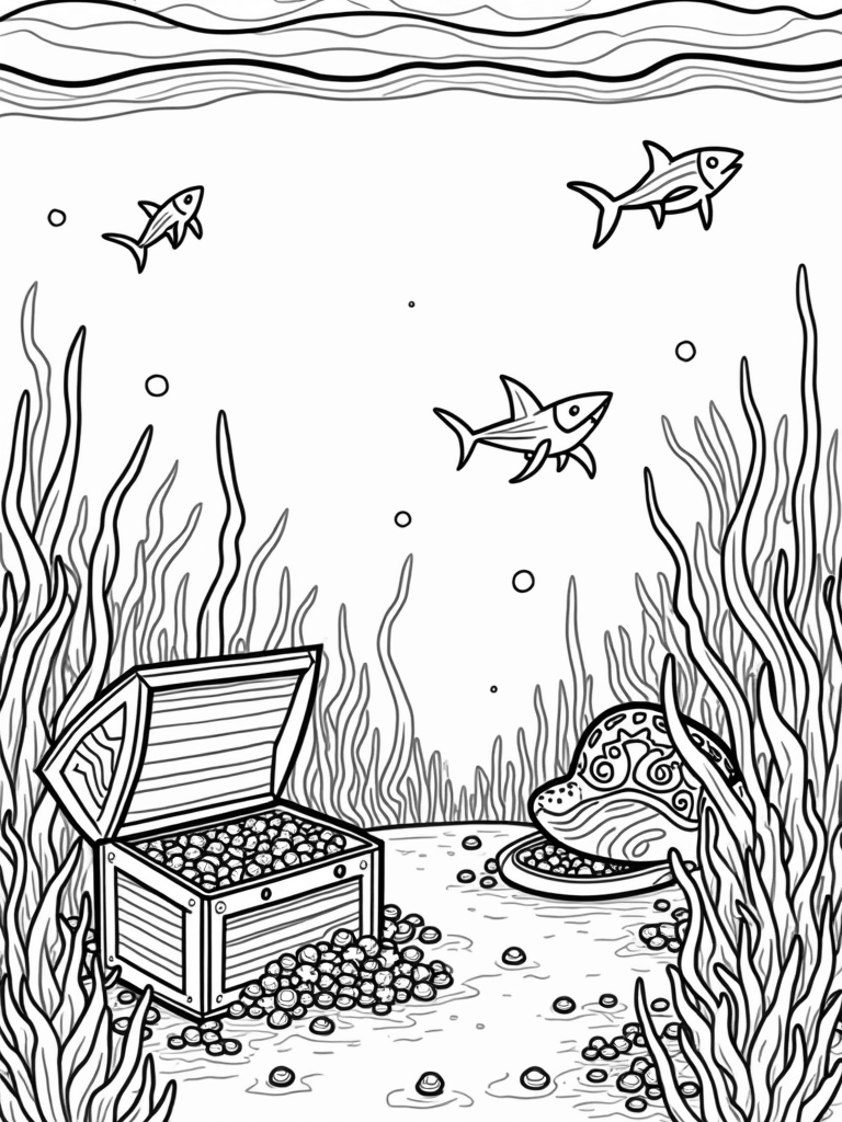 Underwater Coral Reef with Colorful Fish and Treasure Coloring Page