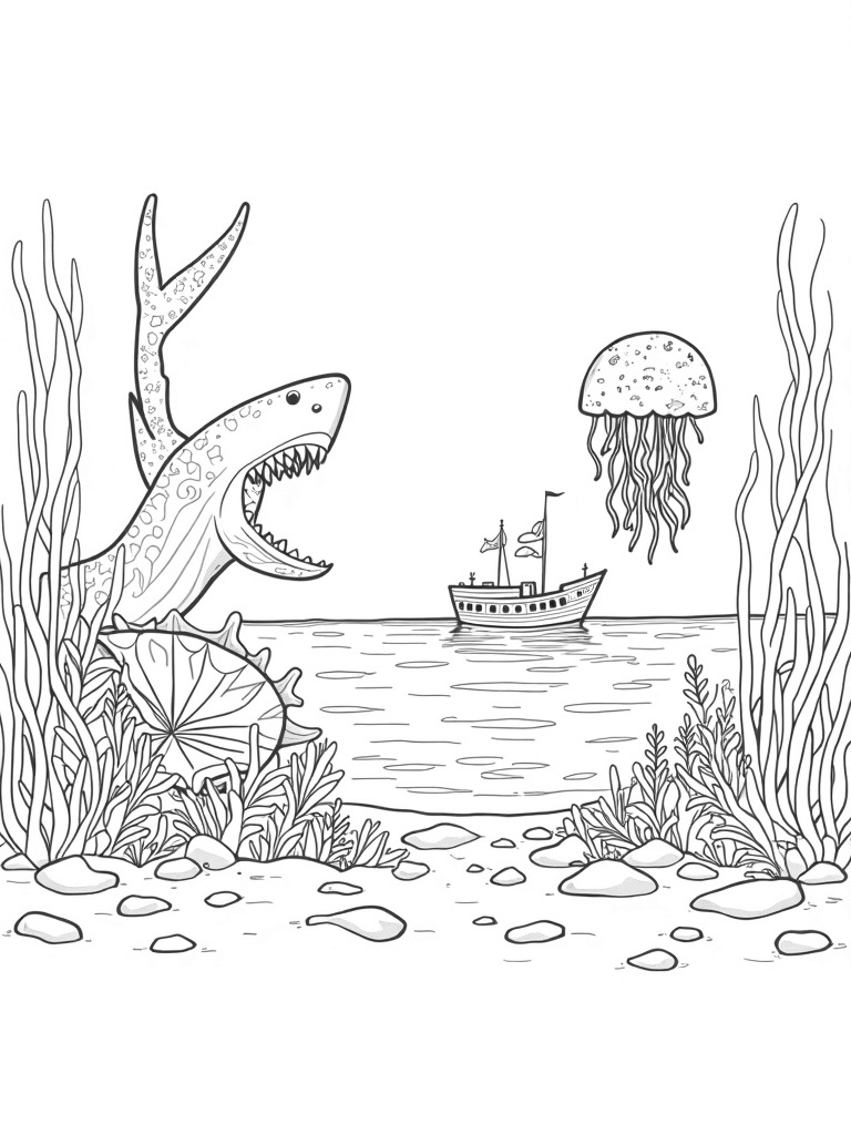 This scene brings the ocean to life with a giant coral reef shaped like a shark! The reef is full of swirling patterns and textures, making it super fun to color. Nearby, there are oversized seashells that look like they just bloomed open, revealing bright starfish nestled inside. And don't forget the jellyfish floating above, their tentacles trailing like beautiful ribbons!