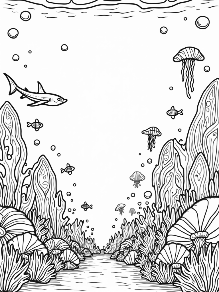 Underwater Garden with a Shark and Jellyfish Coloring Page