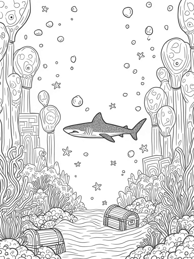 Underwater Garden with Giant Coral and a Shark Coloring Page