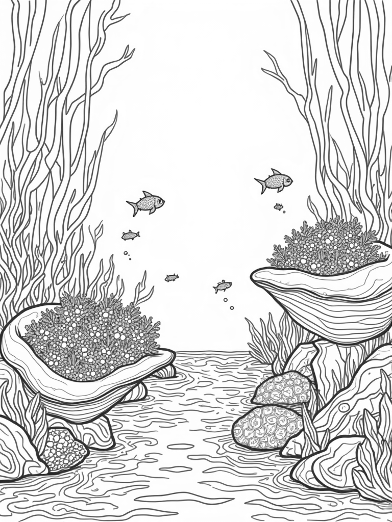 Underwater Garden with Giant Seashells and Coral Blooms Coloring Page