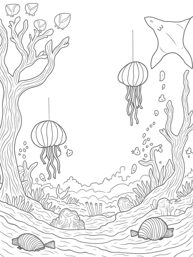 Underwater Garden with Giant Seashells and Jellyfish Coloring Page