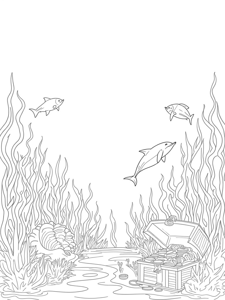 In the background, there’s a sunken treasure chest that has burst open, spilling out shiny coins and sparkling pearls. It’s the perfect little detail that adds excitement to your coloring adventure. And just when you think it couldn’t get any better, a playful dolphin leaps through the scene, sending ripples across the water. It’s like he’s inviting you to join in on the fun!