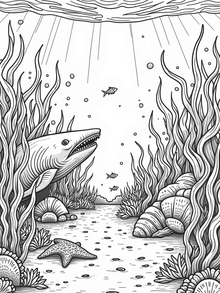 This coloring page shows a vibrant underwater garden bursting with life! You'll see giant kelp fronds that look like swaying trees, creating a magical forest below the waves. Right in the middle, there's a massive rock formation shaped like a shark, covered in beautiful coral patterns. It's like nature's own sculpture!