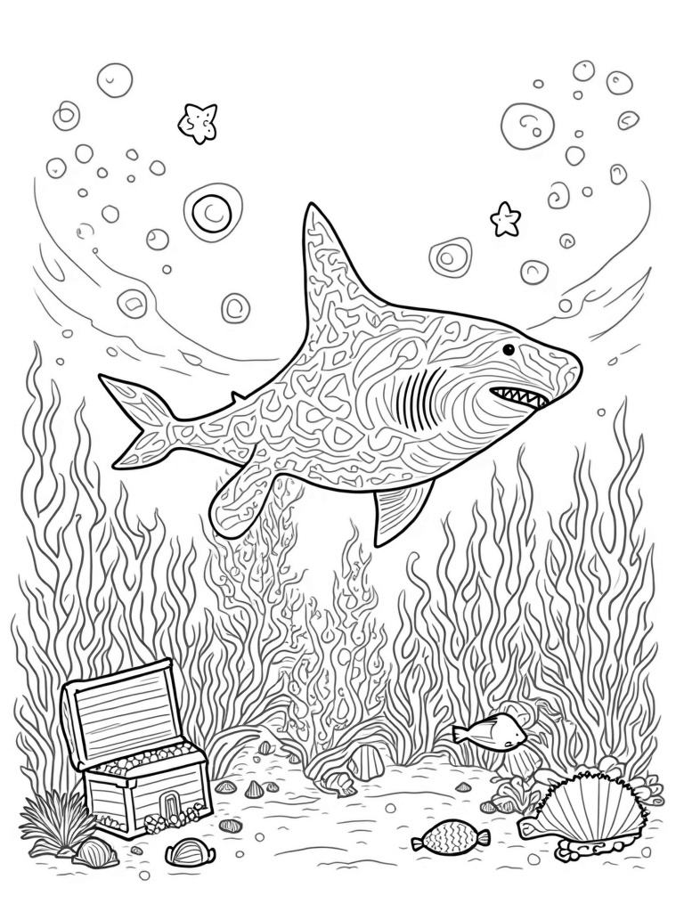 Keep an eye out for bubbles rising in a fun, rhythmic pattern! They dance up towards the surface, bringing a sense of life to this underwater world. And if you look closely, you’ll find a sunken treasure chest peeking out from the sand, shining with the sunlight filtering through the water. It’s a delightful mix of marine life and hidden treasures waiting for you to color in!
