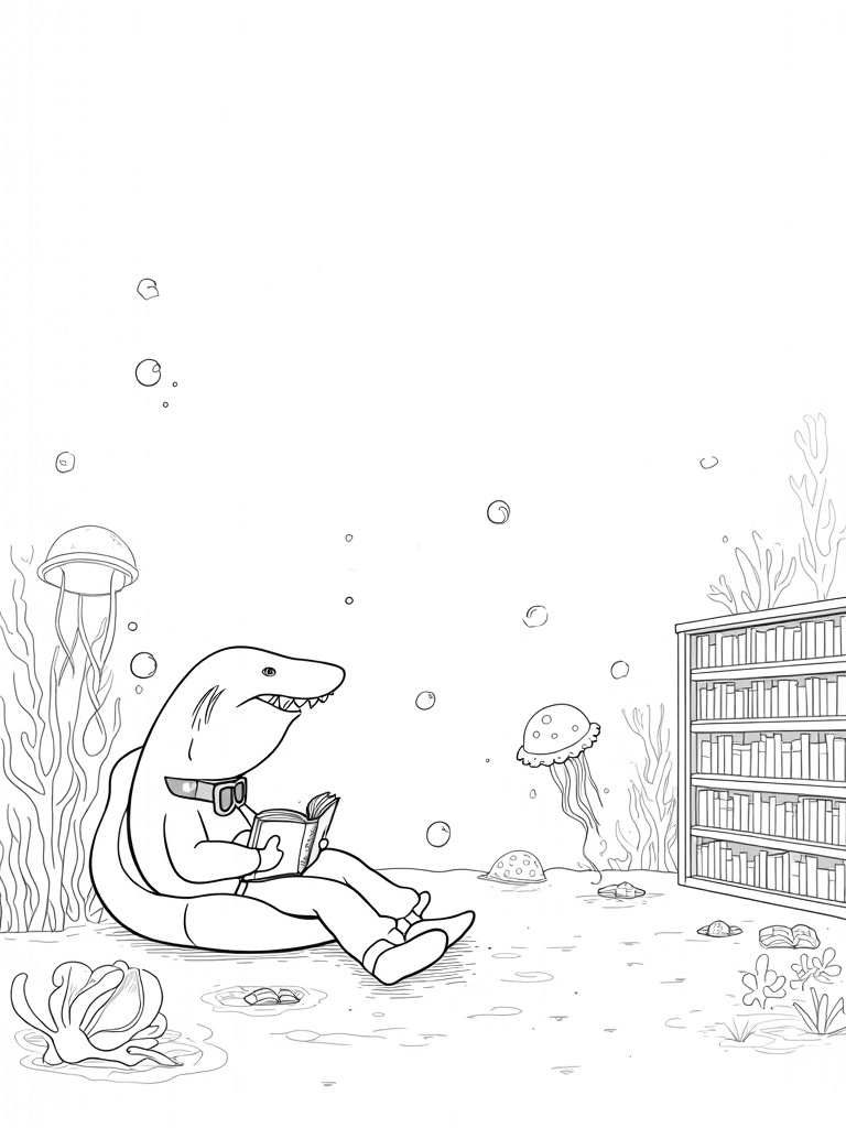 With bubbles rising like thoughts above, this scene is perfect for sparking creativity. Kids can color the shark, the playful jellyfish, and all those delightful books, bringing the underwater world to life in their unique way.