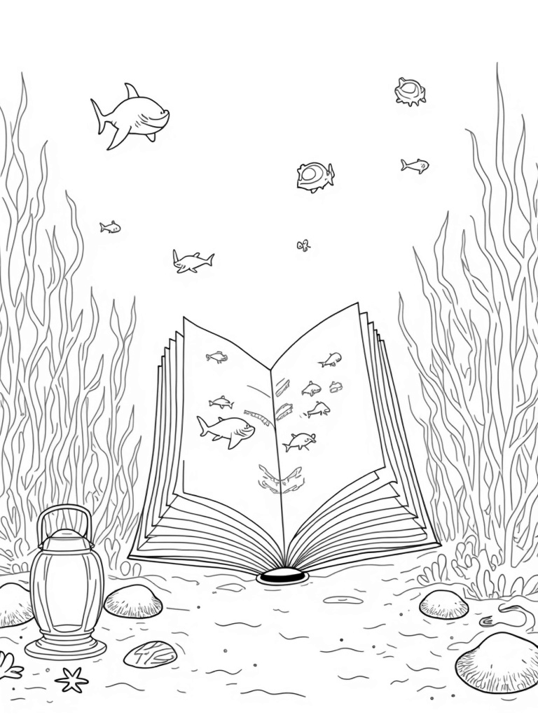 Check out this free, printable coloring page featuring an underwater library filled with shark-finned books and glowing jellyfish lanterns. Perfect for kids who love sharks and ocean adventures, this coloring page is a fun way to explore creativity!