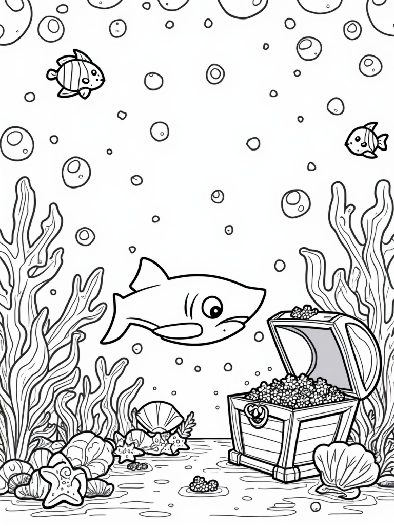 This vibrant underwater scene is bursting with oversized coral formations that resemble quirky sea creatures. A friendly shark glides through the water, keeping company with playful schools of brightly colored fish. Nearby, a giant seashell opens up to reveal a treasure chest, overflowing with glittering seashells and shiny starfish. It's a lively, enchanting underwater meadow that invites creativity!