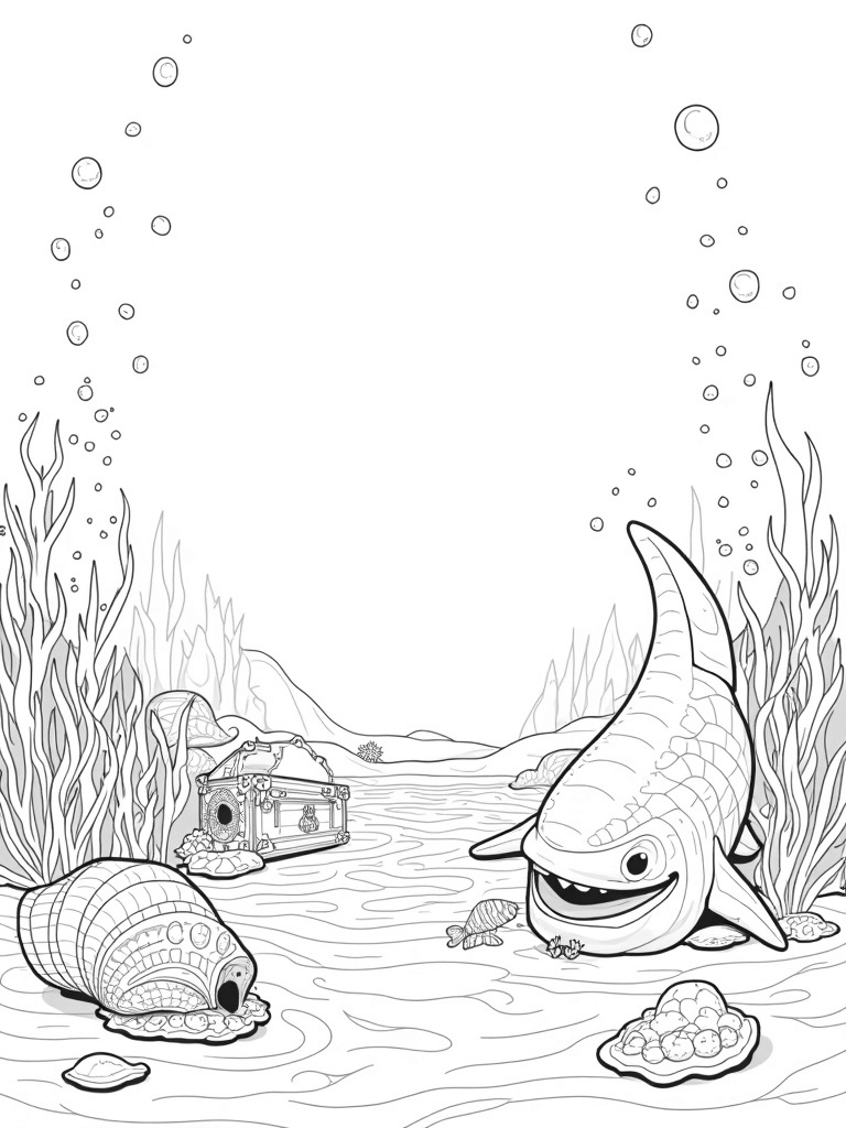 Check out this free printable coloring page featuring an underwater landscape with a shark-shaped rock, seashells with pearls, and playful fish. Perfect for kids who love ocean themes and want to dive into some fun coloring!