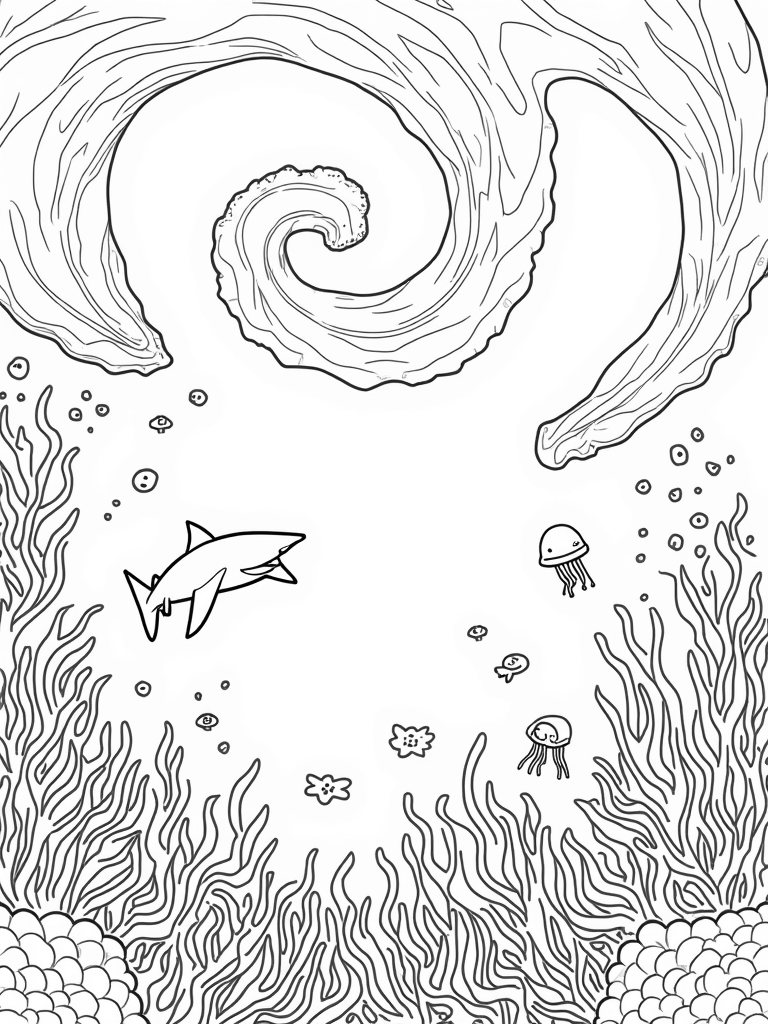 Check out this free printable coloring page featuring a deep-sea world filled with giant seashells, colorful coral gardens, and a graceful shark. Perfect for kids who love ocean life, it's a fun way to get creative with your colors!