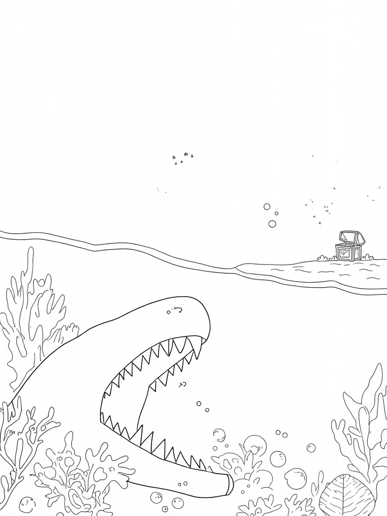 This page showcases a stunning underwater landscape where a gigantic coral reef resembles a shark's open mouth. Brightly colored fish swim in and out of the coral teeth, making it feel alive and vibrant. You'll also find oversized seashells scattered across the ocean floor, adding to the playful scene.