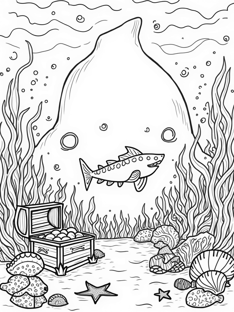 Underwater Wonderland with Shark Coral and Treasure Coloring Page