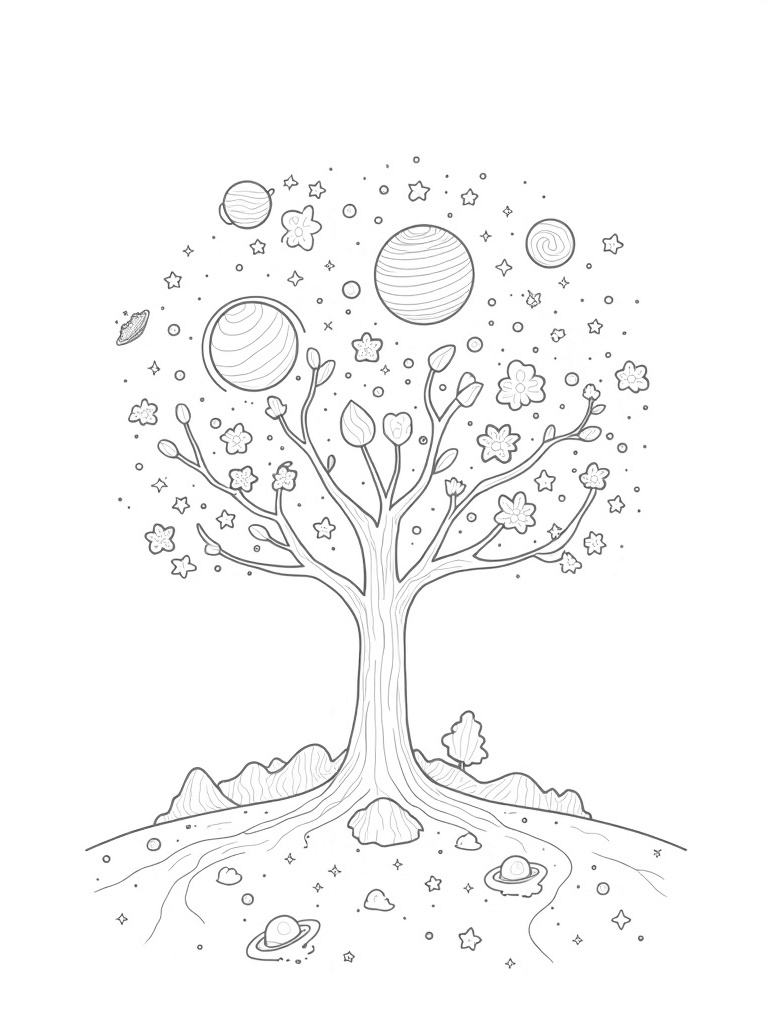 Imagine a magical garden in space where planets bloom like vibrant flowers on a cosmic tree! Each planet showcases its own unique patterns and textures, making them look like they belong in a dream. You’ll see swirling rings orbiting around them, adding to the cosmic charm. Underneath the tree, enormous star-shaped leaves are scattered across a dark, starry ground, creating a beautiful contrast.