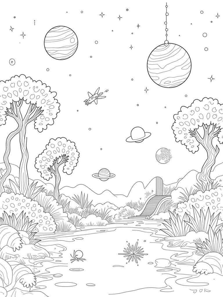 This coloring page showcases a magical celestial garden on a distant planet. Imagine oversized planets hanging like delicious fruit from twisted vines, just waiting for your colorful touch. Luminous stars bloom like flowers, each petal radiating bright light, creating a dazzling display that’s out of this world!