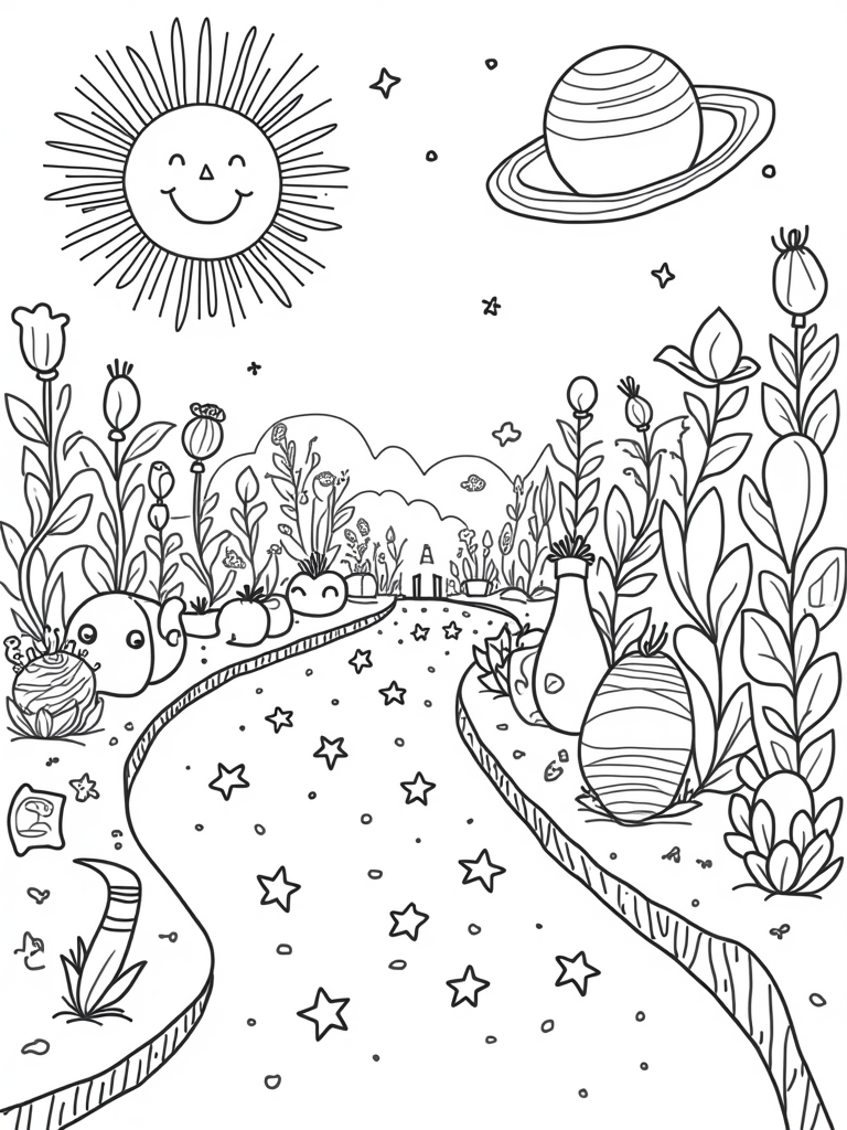 In one corner of this magical garden, a crescent moon holds a bunch of twinkling stars, just waiting to shine brightly. And don’t miss the friendly asteroid rolling around, dressed up in fun patterns and shapes! It’s a place where imagination runs wild, and every color you choose makes this space garden come alive. So grab your favorite crayons and let your creativity fly among the stars!