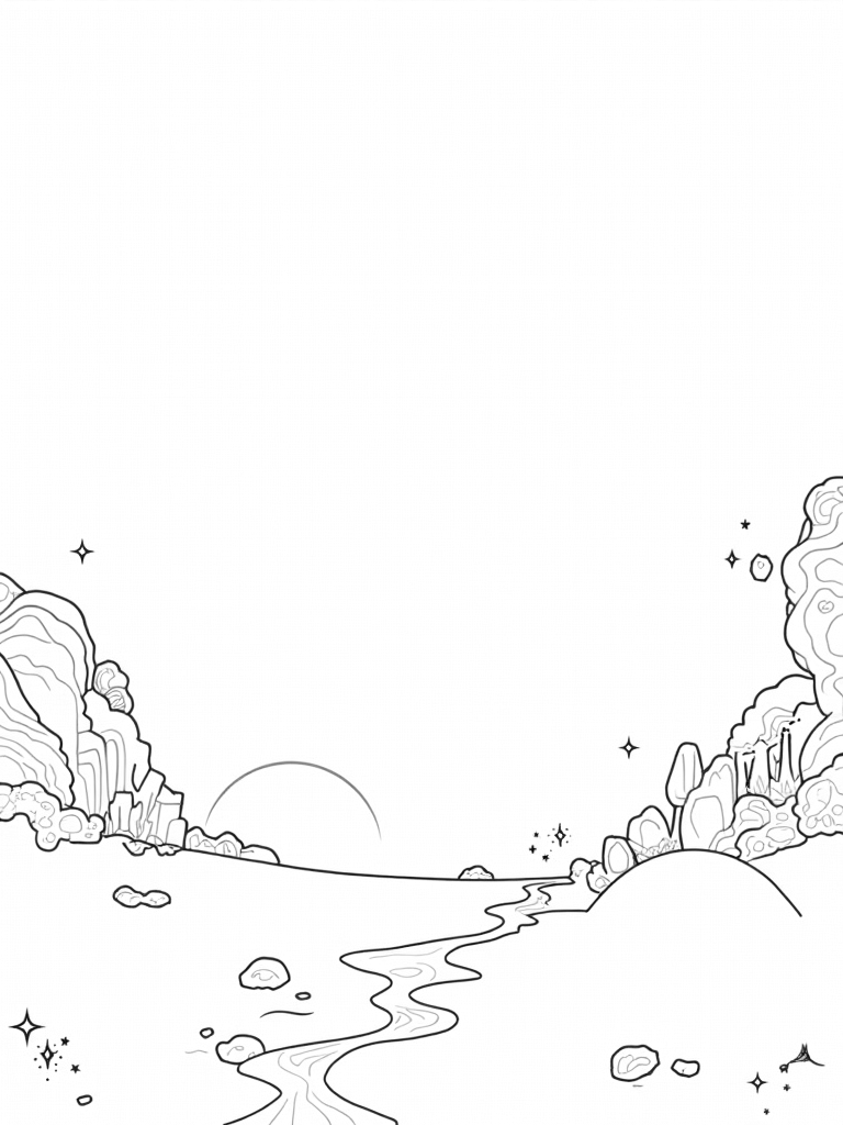 Below all the cosmic action, there's a peaceful planet with beautiful rings decorated with floating crystals. These crystals create playful shadows on the planet's surface, making it look even more enchanting. You can color the planet any shade you like—maybe a bright blue or a soft lavender! Let your imagination run wild!