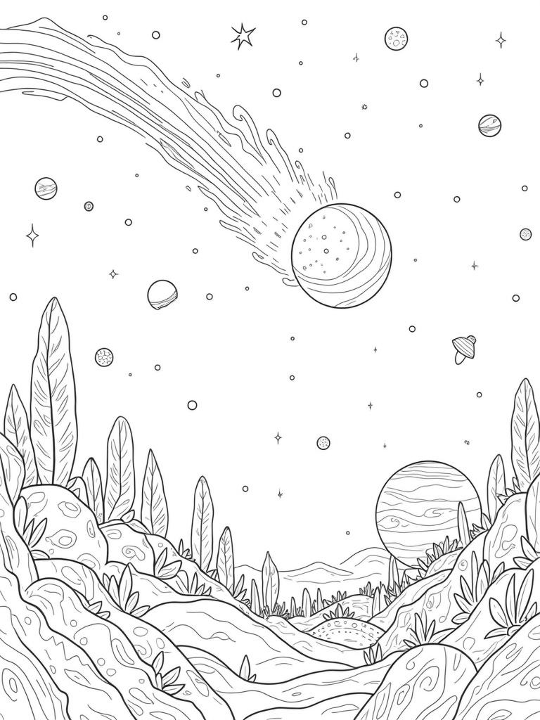 Completing this celestial scene is a distant nebula, swirling in soft colors and providing a dreamy backdrop. Whether you’re using bright colors or soft pastels, this cosmic garden is sure to spark creativity and bring out your artistic side.
