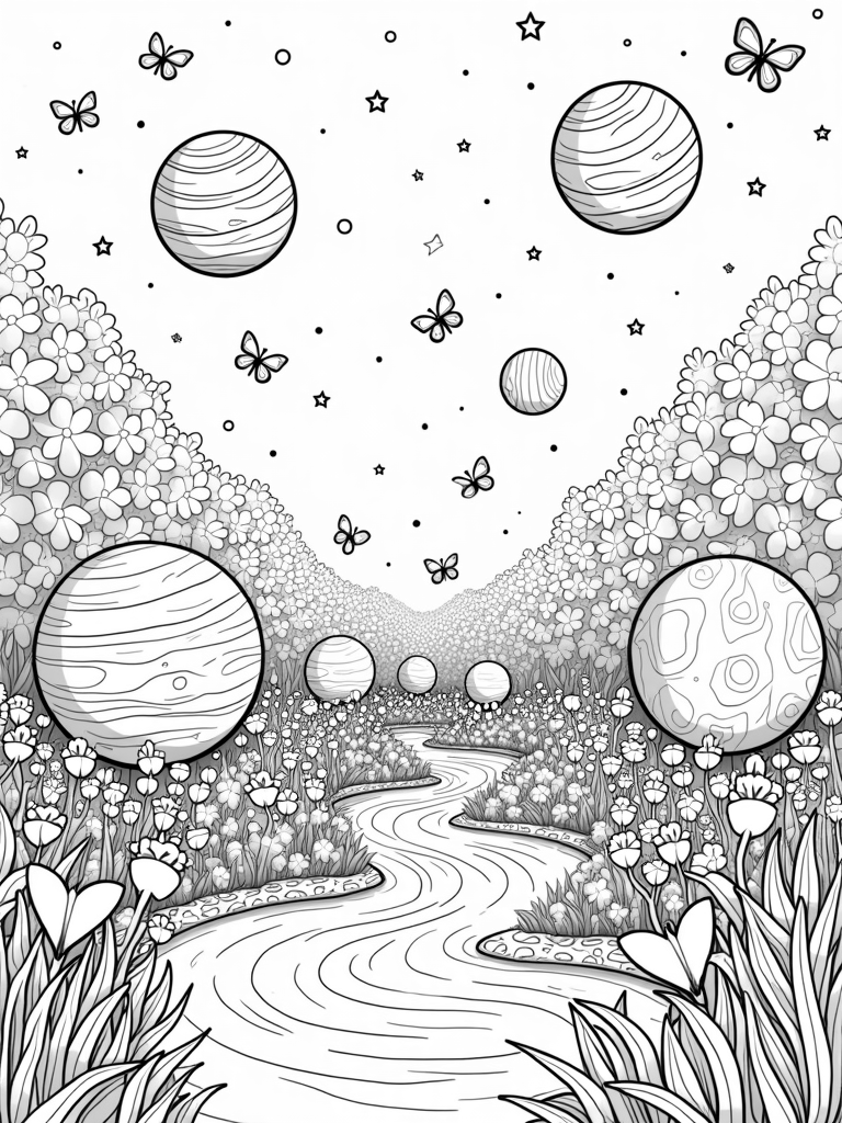 Cosmic Garden of Blooming Planets and Butterflies Coloring Page