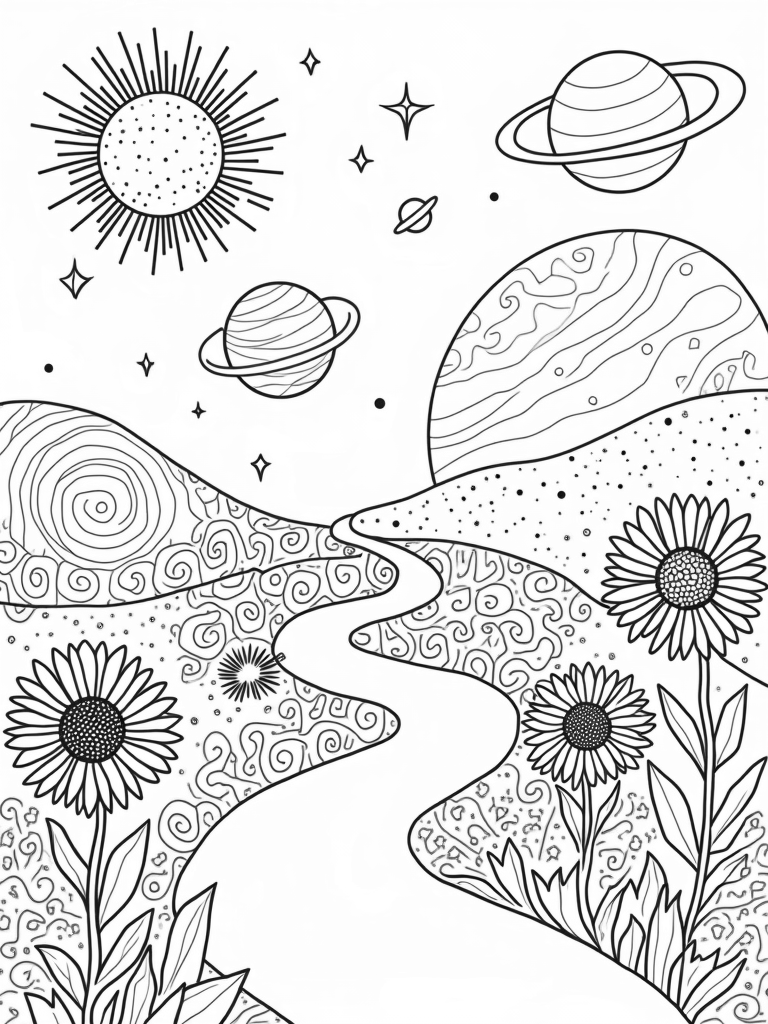 This page is like a magical garden floating in space! You’ll find flowers shaped like planets blooming all around, each one bursting with color. A path made of stardust winds through it all, leading to a huge sun that sends out spiraling rays. Nearby, a crescent moon holds a sprinkle of tiny stars, while an asteroid belt dances around a distant nebula, making everything feel even more cosmic.