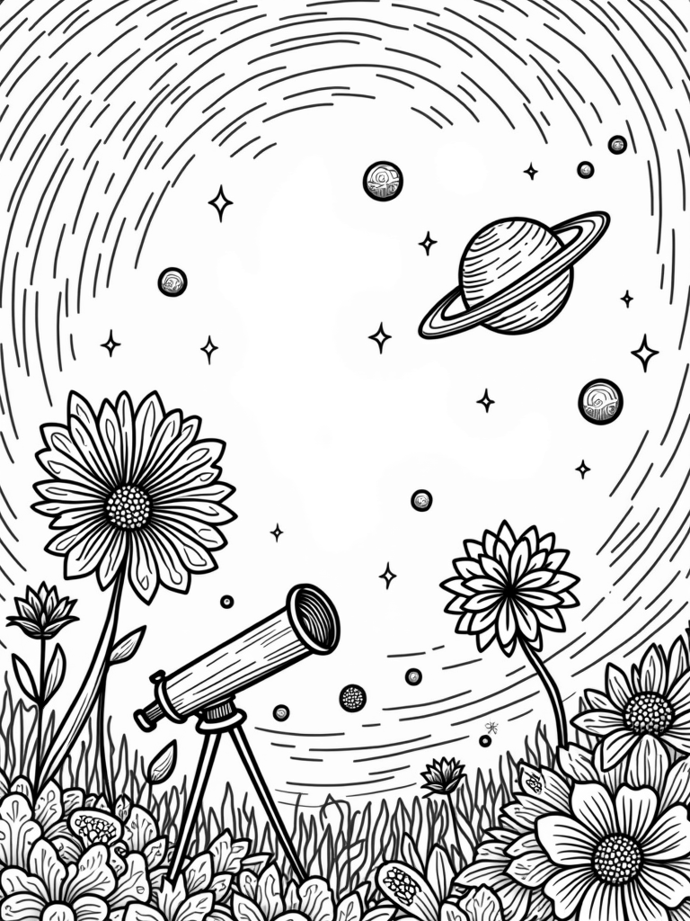 Cosmic Garden with Blooming Planets and a Giant Telescope Coloring Page