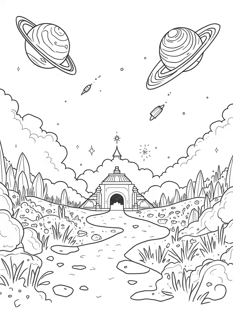Cosmic Garden with Floating Planets and Glittering Stardust Coloring Page