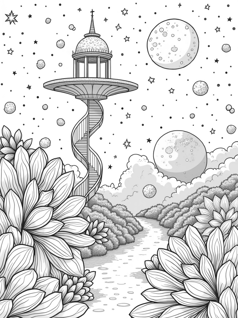 Cosmic Garden with Nebula Flowers and Crystalline Planet Coloring Page